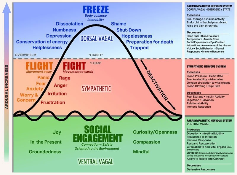 Graphic by Arienne Missimer. Polyvagal theory is one of many different neuroscience theories of emotion. This theory includes three systems: 1) fight or flight response (sympathetic nervous system), 2) social engagement or “relax and connect” response (parasympathetic – ventral vagal), or 3) freeze response (parasympathetic – dorsal vagal).